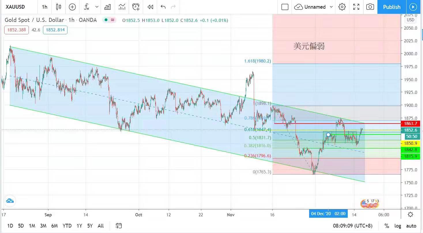 英國脫歐談判傳出正面消息,市場傳出國會將在年底批准第二輪規模為9千億美元的疫情刺激法案,投資者憧憬美元會進一步下跌,支持金價上升至1853美元的轉折點。