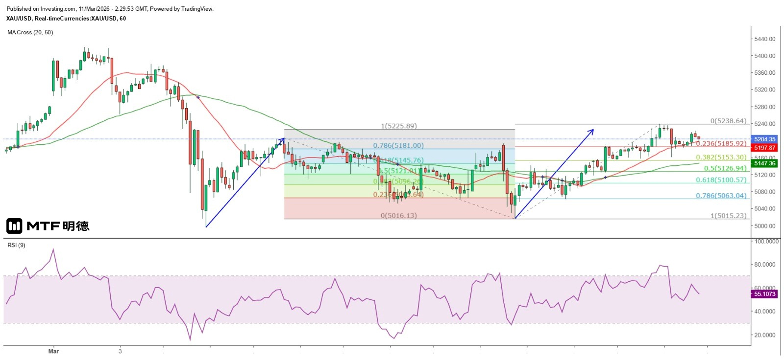 再從小時圖觀察,昨天的高位接近費波納奇100%擴展幅度所及的5224.99美元,故初步上升目標算已達到,短期或再現調整。如金價明顯失守小時圖20SMA,則傾向下試50SMA(現約5147)後才反彈,且9月9日以來最大升幅的38.2%調整目標位於5153.3美元,與50SMA較接近,如金價跌至該位附近即強力反彈,則反映金價的升勢仍然強勁。相反,如金價跌穿50SMA,或試穿5126.94美元,同時亦未見好友強力反攻,則再試5000美元的可能性增加。