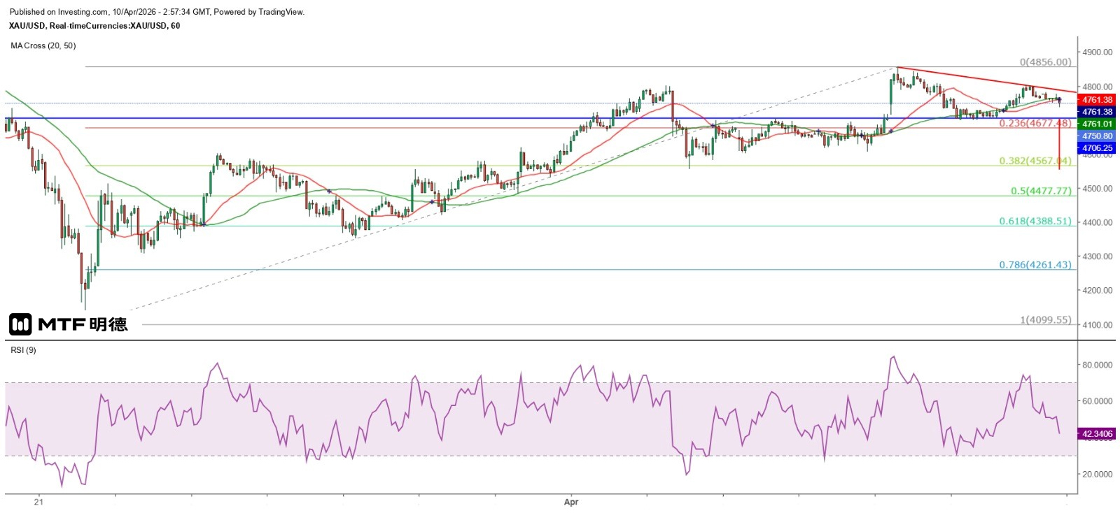 從小時圖觀察,金價自3月23日以來的升勢有轉弱跡象,一浪高於一浪形態或於昨天打破,估計好淡雙方將於4700美元有一番爭持,能否繼續守穩在該位以上極其關鍵,短期走勢或以4700美元作為強支持,並以平底下降三角形發展,美伊談判過程傳出的消息料令金價反覆波動,金價一旦失守4700美元,並由支持變成阻力, 則以4567.04美元為首個重要支持位,而4800美元顯然已成為短期強阻力。