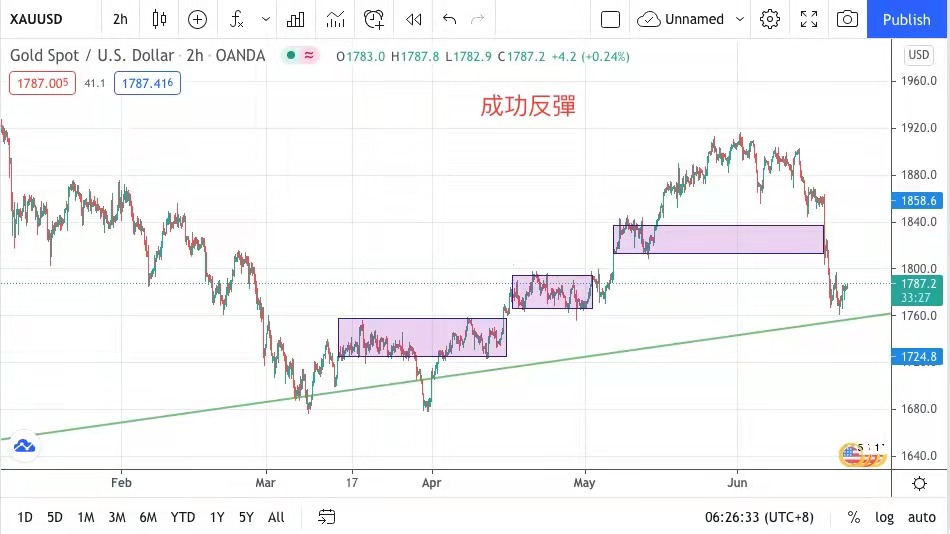 金價週綫圖顯示,金價已下跌近至2019年大時代的上升支持軌,加上美元指數下滑,金市昨日從低位1764美元反彈至最高1786美元,最終以1783美元收市,升19美元。