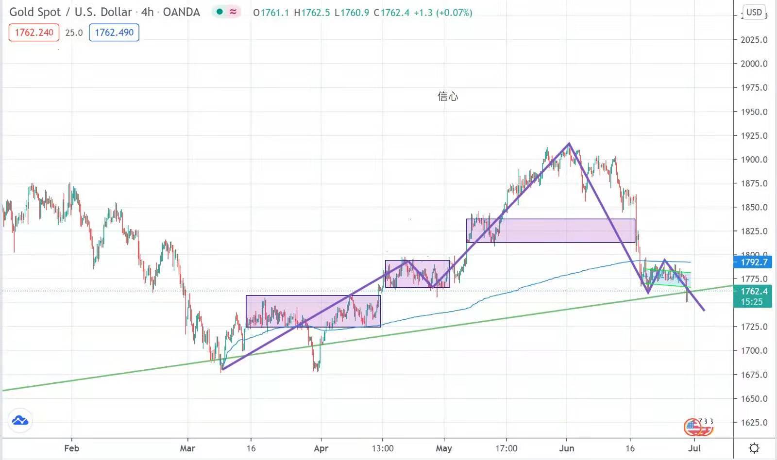 金市昨日回軟,昨晚美國公佈6月美國諮商會消費者信心指數升至疫情以來新高,助長美元繼續走高,打壓金價。金價曾跌近1750美元,雖反彈1761美元收市,走勢仍危危乎!非農就業報告週五出爐,但今晚先有小非農登場,市場預計美國6月份非農就業人口變化將增加60萬人,少於5月份的97.8萬人。而就業市場是聯儲局對在何時加息,除通脹以外的另一項參考指標,今晚數據只要比市場預期好,將進一步刺激美元上升,金價將下試1743美元。今日策略以空貨較為佔優。今日建議波幅在1768-1743。
