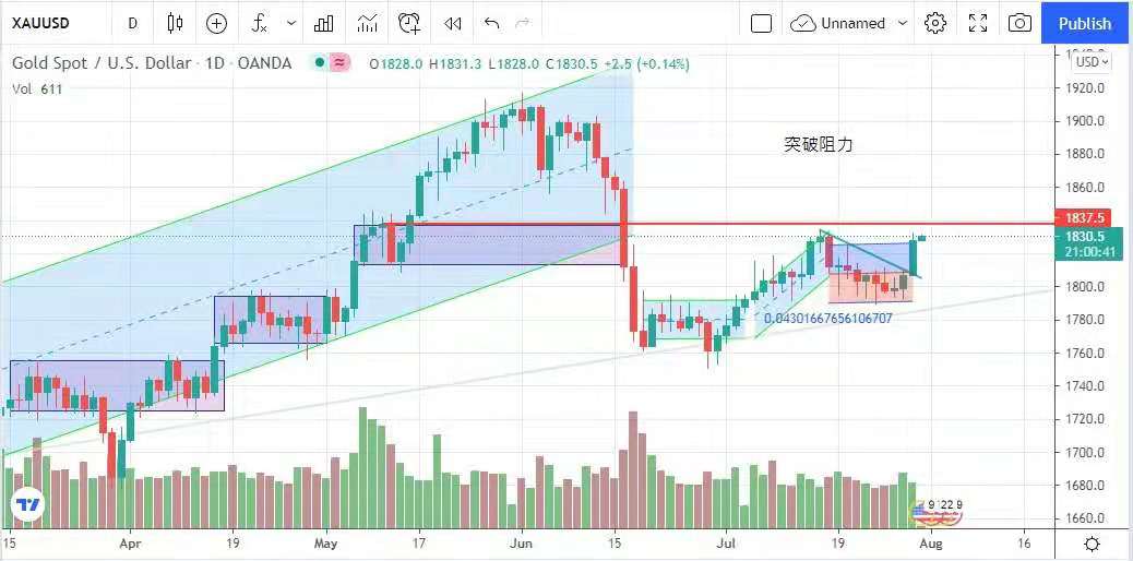 美聯儲放鴿,表示病毒仍威脅美國經濟,還沒有任何縮減買債時間表。而昨日經濟數據完全指向支持美聯儲決定,美國第2季經濟增長放緩及美國上週首度申領失業金人數高於預期,美元指數及十年期國債孳息率下跌,助長金價上升,金價曾藉此衝高見1833美元,最終以1828美元收市,升21美元。