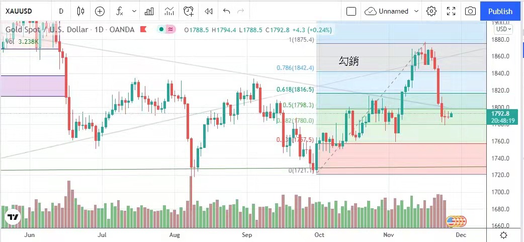 美國感恩節假期,市場缺乏方向,交投淡靜,上下波幅不足10美元,在新變種病毒通的威脅與及脹憂慮推動下,美元指數從16個月的96.93高位回落,