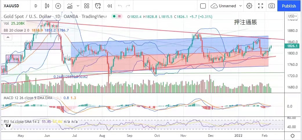 最新一月通脹數據,金價連脹三日,金價昨日成功挑戰1825美元,並曾試撲向1830美元,看似強勢;然而烏克蘭與俄羅斯邊境的緊張局勢經法國及