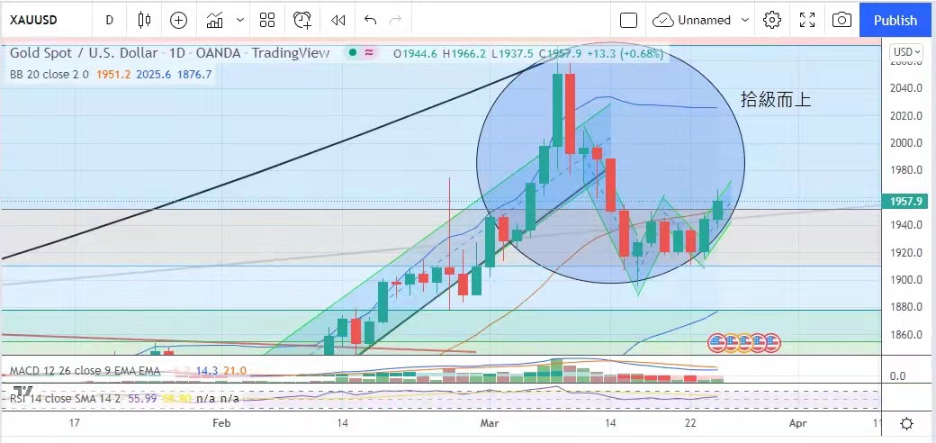 美股因勞工數據創近50多年以來新低而造高,但亦阻不了黃金對投資者的吸引力,金價昨日最低見1937.5美元,數據公布後金價升穿1950美元阻力,最高曾升至